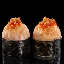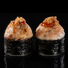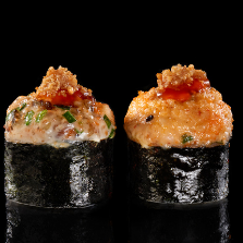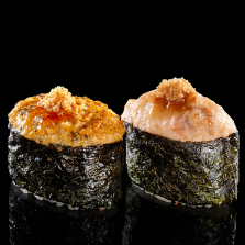 Lachs | Zwiebeln | Yaki-Sauce | Unagi-Sauce | Sesam Chips